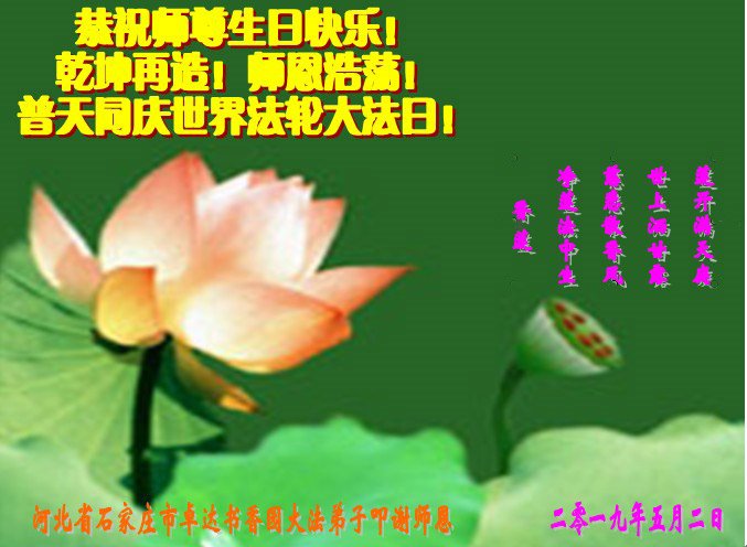 Bản tiếng Hán: https://www.minghui.org/mh/articles/2019/5/9/石家庄大法弟子恭贺世界法轮大法日暨师尊华诞-27条–386245.html