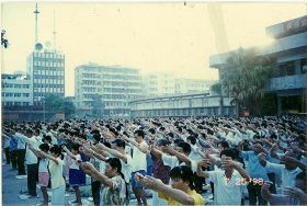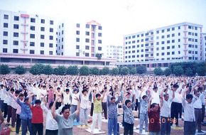 Các học viên Pháp Luân Công ở Mai Châu luyện công theo nhóm ở huyện Mai, quảng trường Hoa Kiều vào ngày 10/10/1998