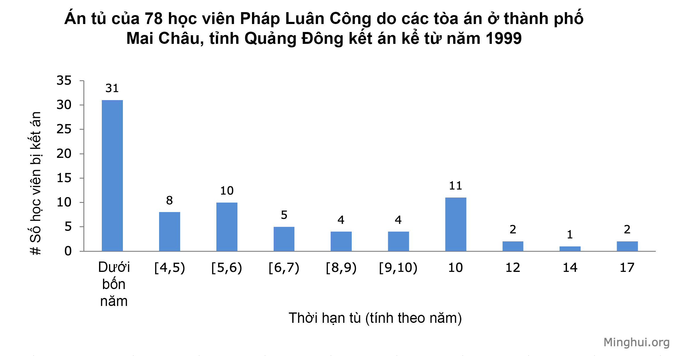 94 bản án tù có thời hạn từ 1,5 đến 12 năm, trung bình là 4 năm 8 tháng. Hầu hết các bản án nặng (lên đến 10,5 năm) đều dành cho những học viên tham gia nâng cao nhận thức về cuộc bức hại, gồm in ấn tài liệu thông tin hoặc gửi tin nhắn qua điện thoại di động.