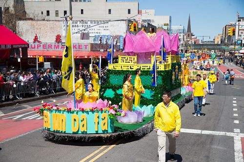 Đoàn nhạc Tian Guo hùng tráng gồm 200 thành viên dẫn đầu đoàn diễu hành với chủ đề “Pháp Luân Đại Pháp hảo”. Theo sau là các biểu ngữ, thuyền hoa, và nhóm biểu diễn các bài công pháp của Pháp Luân Đại Pháp đã thu hút sự quan tâm của hàng nghìn khán giả.